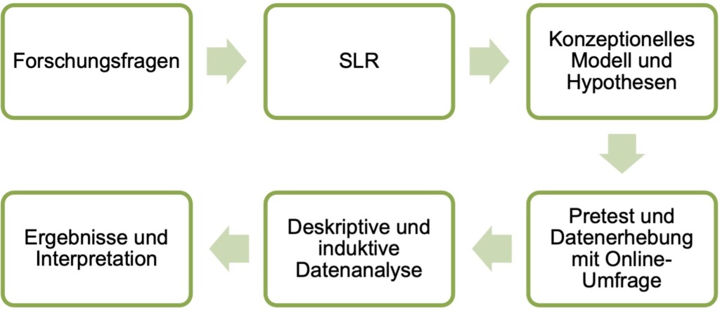 Generell kann in der empirischen Sozialforschung zwischen einem qualitativen und quantitativen Forschungsdesign unterschieden werden. Während sich die qualitative Forschung auf explorative und kleine Datensätze konzentriert, umfasst die quantitative Forschung die strukturierte Datenerhebung mit einer großen Anzahl von Datensätzen. In einem ersten Schritt des Forschungsdesigns zu CyberWuP wurden relevante Fragestellungen aus einer systematischen Literaturrecherche und einer qualitativen Studie identifiziert. Dabei wurde ein konzeptionelles Modell mit Hypothesen abgeleitet. Diese bilden die Grundlage für eine weitere Datenerhebung auf Basis eines quantitativen Studiendesigns. Sowohl deskriptive Auswertungen als auch induktive Verfahren der multivariaten Datenanalysen (z. B. Strukturgleichungsmodelle) sollen Potenziale von Cybersecurity-Maßnahmen in KMU und deren Einflussgrößen aufdecken. Folgende Abbildung veranschaulicht wesentliche Schritte des Forschungsdesigns: